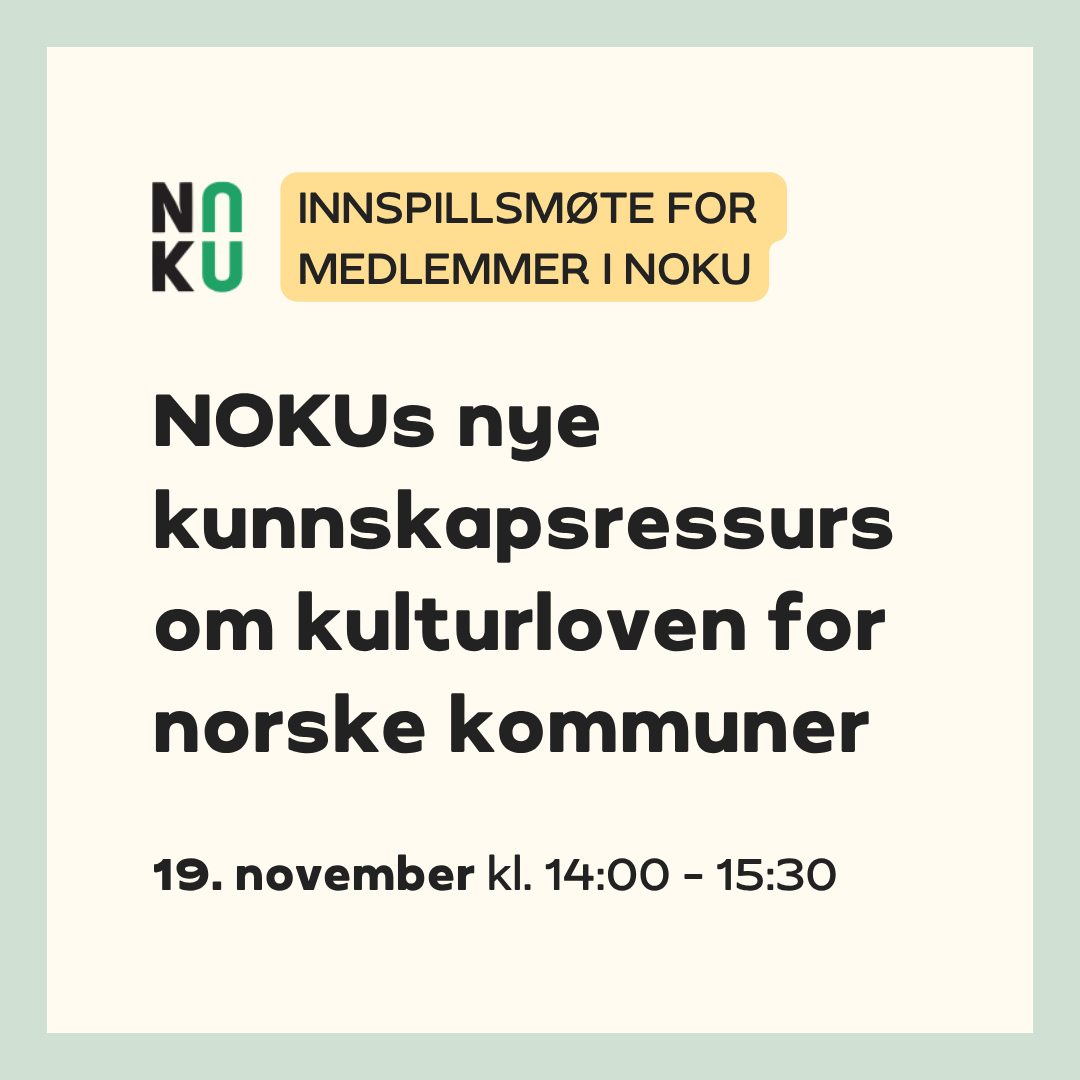 Digitalt medlemsmøte 19. november kl. 14:00 - 15:30 om NOKUs nye kunnskapsressurs om kulturloven. Eksklusivt for NOKU-medlemmer.
